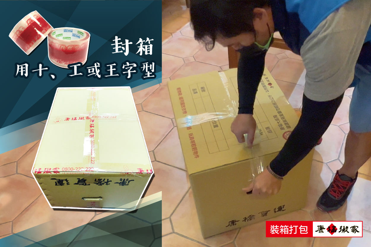 使用透明膠帶封箱可用十、工或王字型來封箱。一捲膠帶約可封10個紙箱。