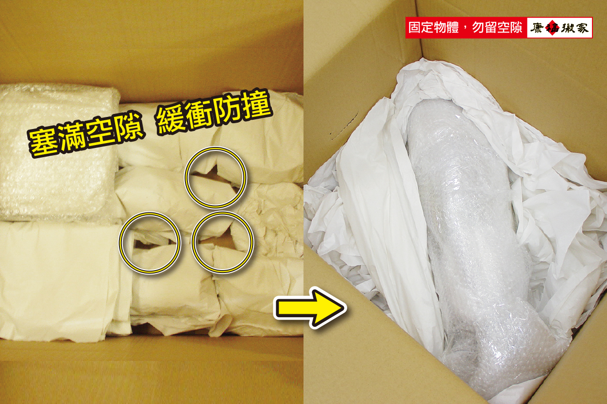 填滿縫細,固定箱內物箱內物件需做固定,避免移動晃動,造成物件相互碰撞。