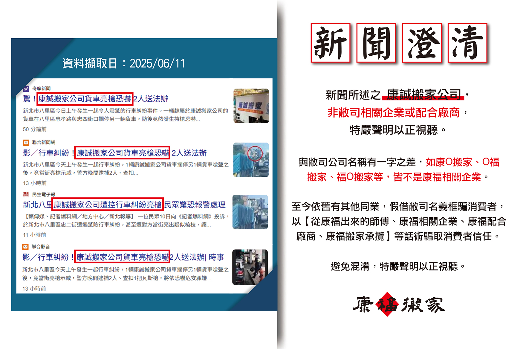 新聞所述之康誠搬家公司,非敝司相關企業或配合廠商,