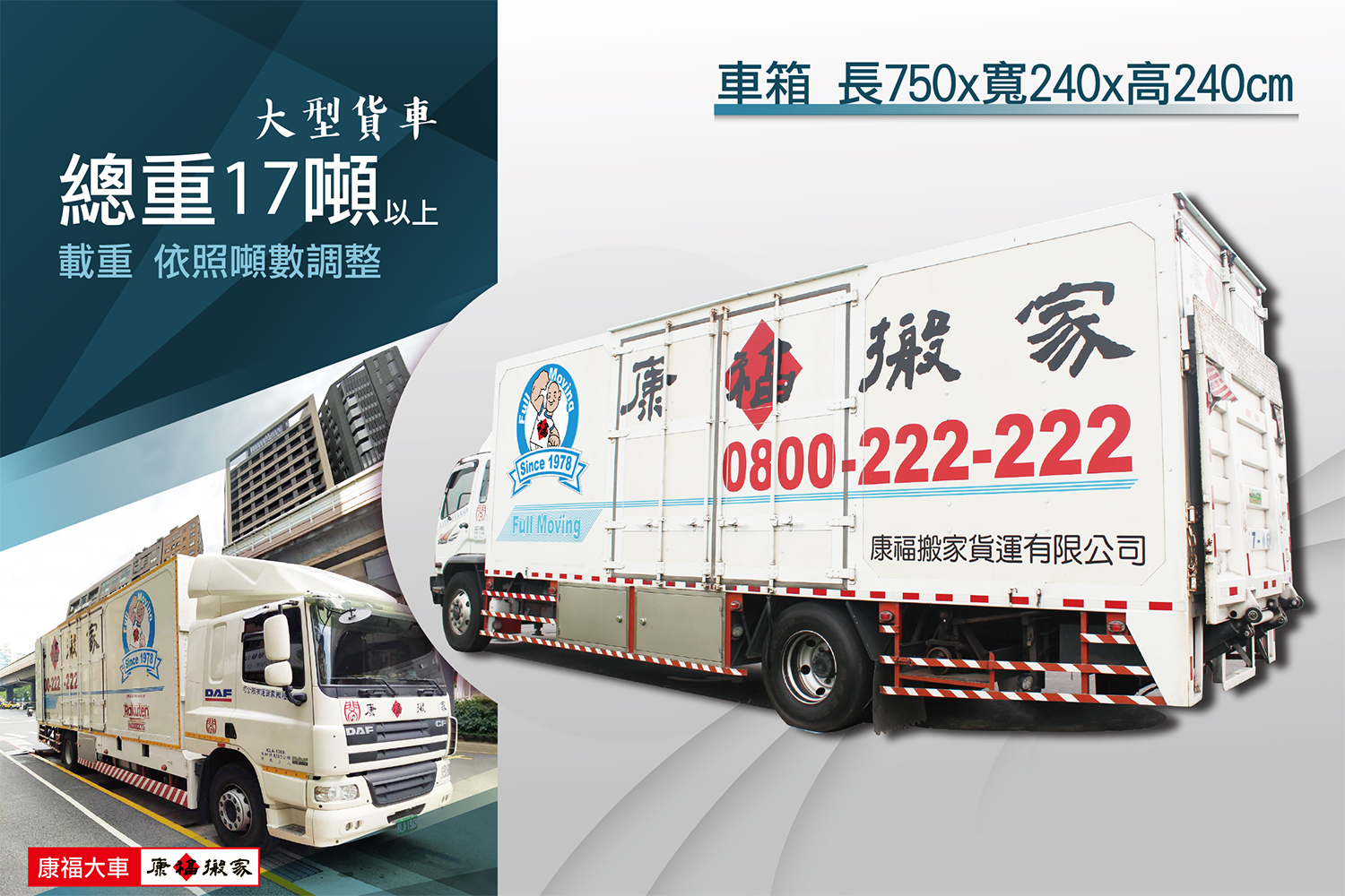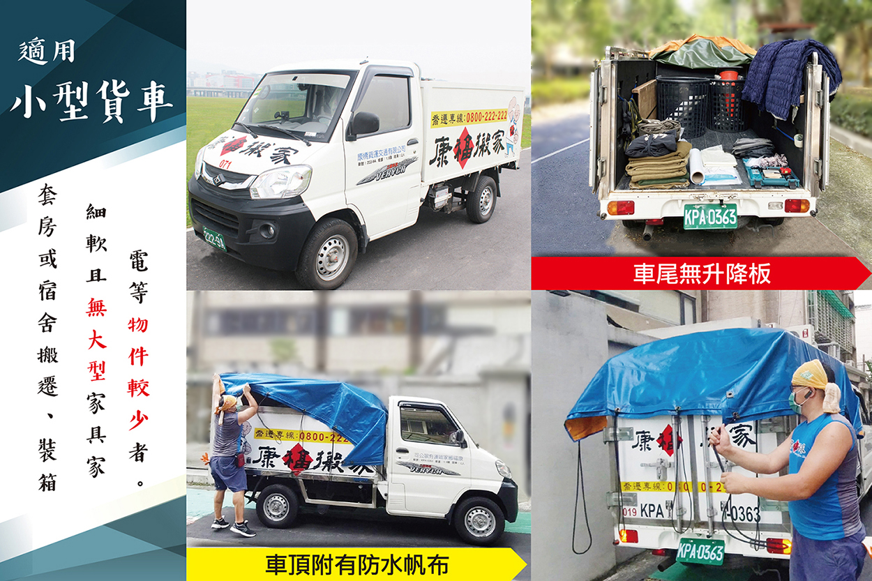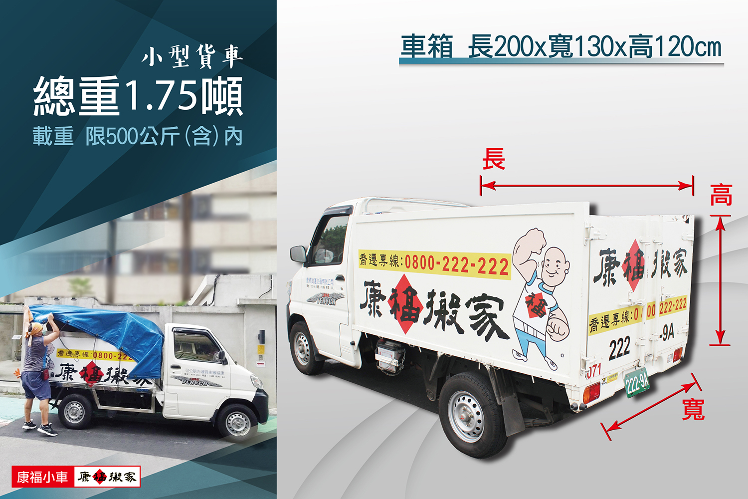 小型車的大小就像是常穿梭在大街小巷中的宅配貨車的一樣,而大型貨車就像是公車這麼大,康福雖擁有豐富的貨車種類及數量,但其調派將會依照客戶的所在位置、需求及搬運物件多寡或物件長寬等來做調派。