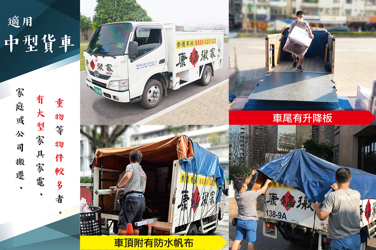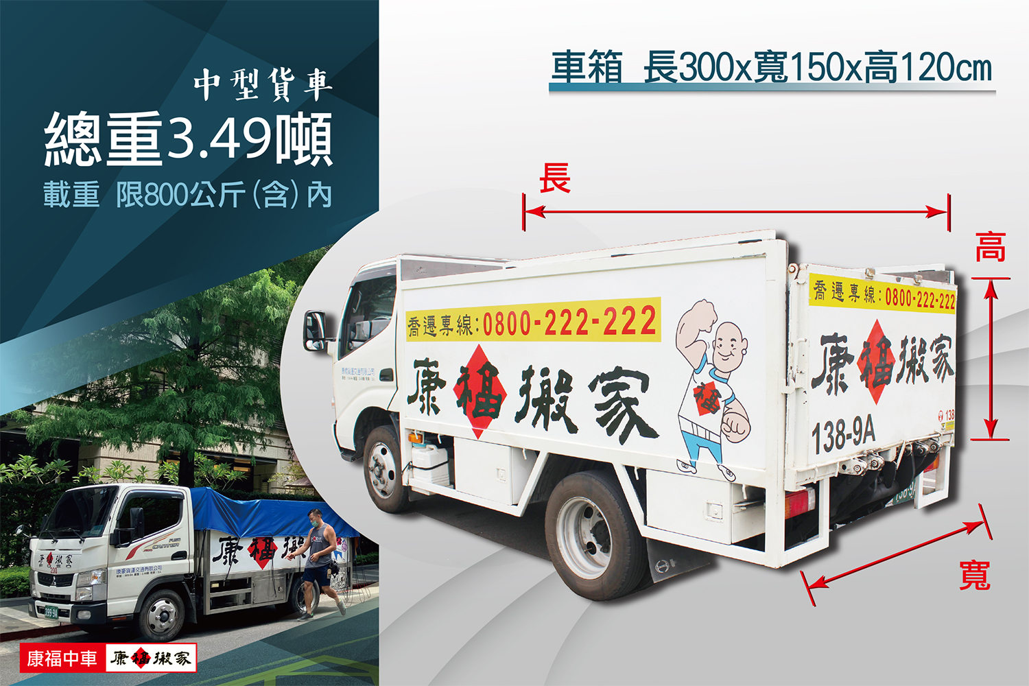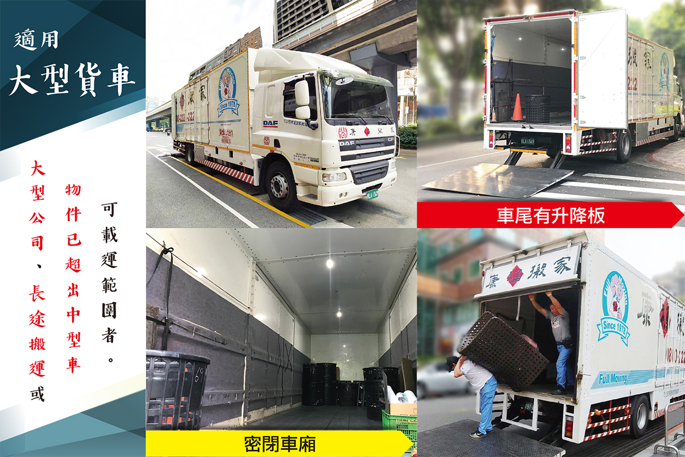 小型車的大小就像是常穿梭在大街小巷中的宅配貨車的一樣,而大型貨車就像是公車這麼大,康福雖擁有豐富的貨車種類及數量,但其調派將會依照客戶的所在位置、需求及搬運物件多寡或物件長寬等來做調派。