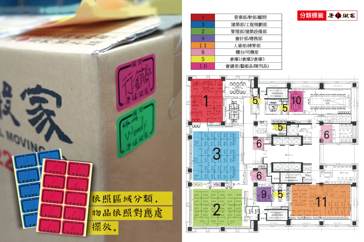 可依照各樓層、各部門、各科處提供不同顏色標籤,以利搬遷時分類。
