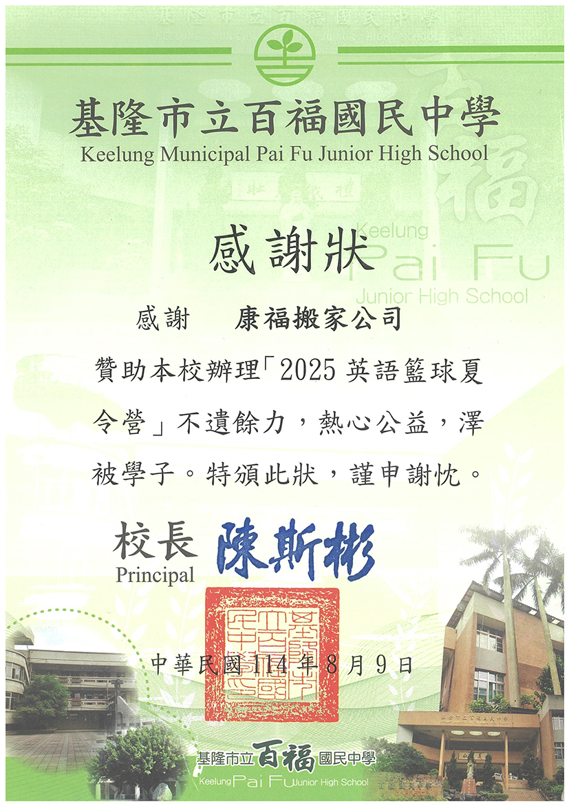 麗山國中,國防大學(原三軍大學),永春高中,泰北高中,台北科技大學,大安高工,濱江國小,三峽國小,民族國小,東吳大學,輔仁大學,海洋大學,政治大學,台灣大學,師範大學,民生國中,民生國小,陽明大學,介壽國中,再興小學,台灣神學院,國立臺灣戲曲學院,財團法人台灣省基督教瑪禮遜協會,財團法人台北歐洲學校,基隆百福國中等。