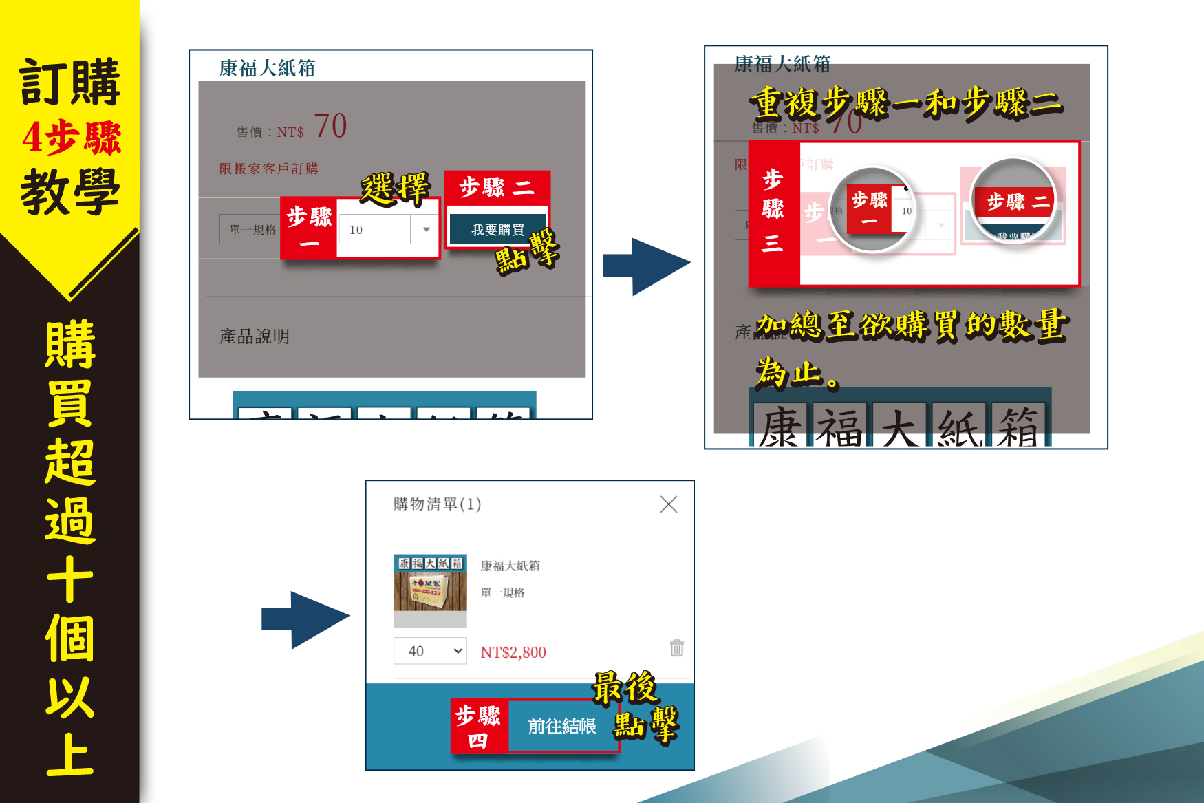 2. 紙箱數量過多,如超過10個以上,請客戶端自行載運至康福搬家門市,並攜帶購買發票,以利退費。搬家當日,師傅不會協助帶回及退費,請留意。